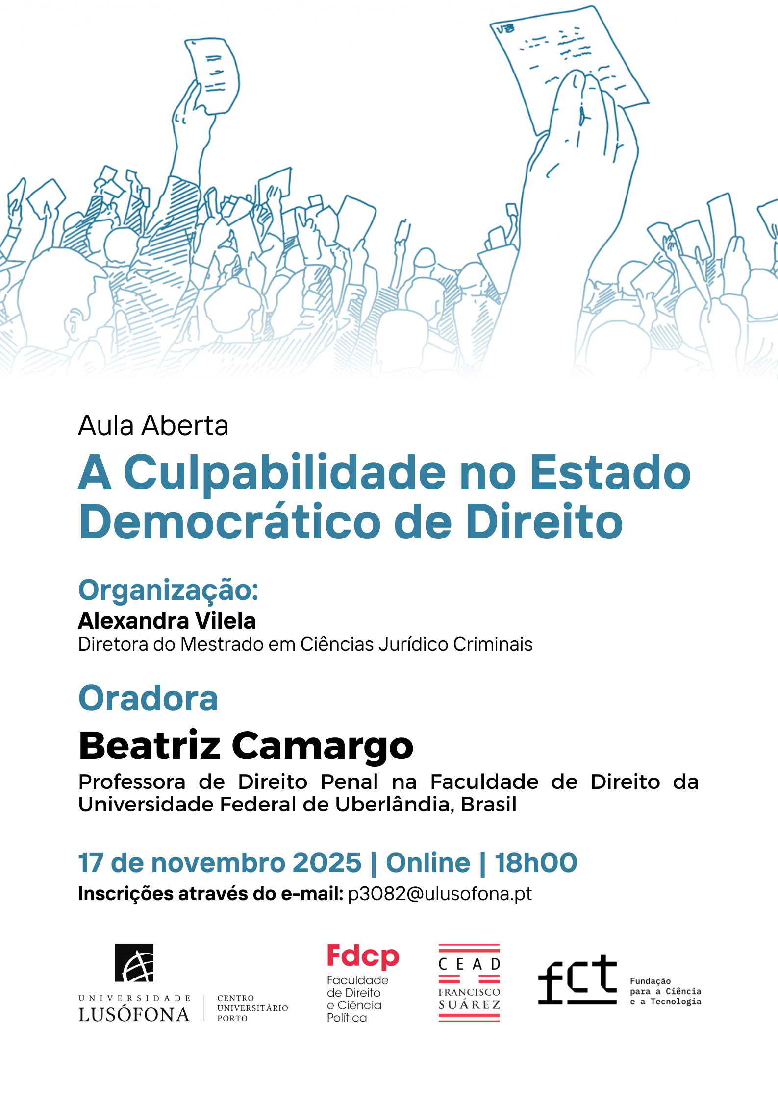 A sessão contará com a presença da Professora Beatriz Camargo, docente de Direito Penal na Faculdade de Direito da Universidade Federal de Uberlândia (Brasil), que partilhará a sua reflexão sobre o papel da culpabilidade no contexto jurídico contemporâneo e os seus desafios no âmbito do Estado Democrático de Direito.