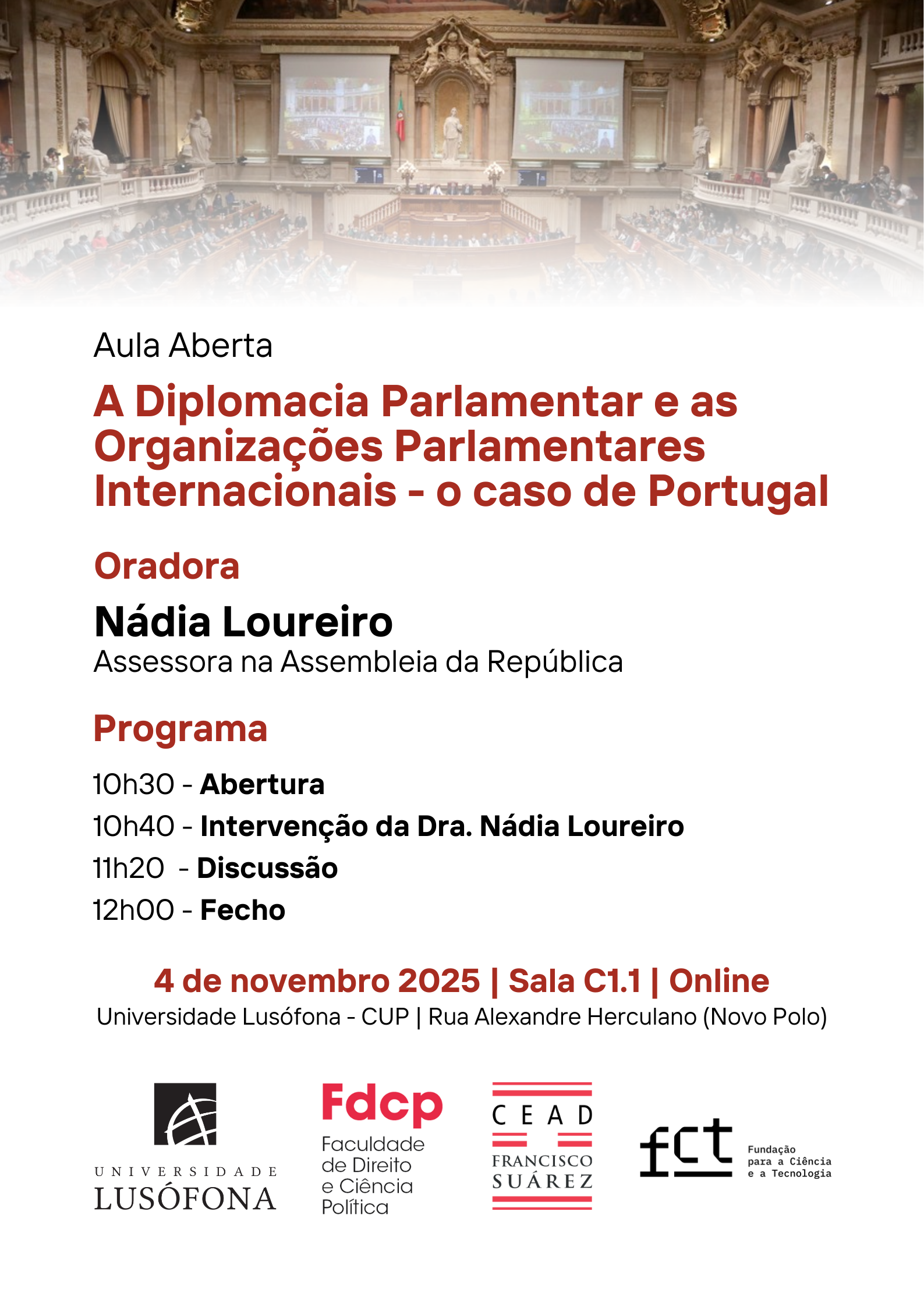 O CEAD Francisco Suárez convida toda a comunidade académica e o público em geral para a Aula Aberta "A diplomacia parlamentar e as organizações parlamentares internacionais - o caso de Portugal", a realizar-se no dia 4 de novembro de 2025, pelas 10h30, na Sala C1.1 da Universidade Lusófona – CUP, situada na Rua Alexandre Herculano (Novo Pólo).