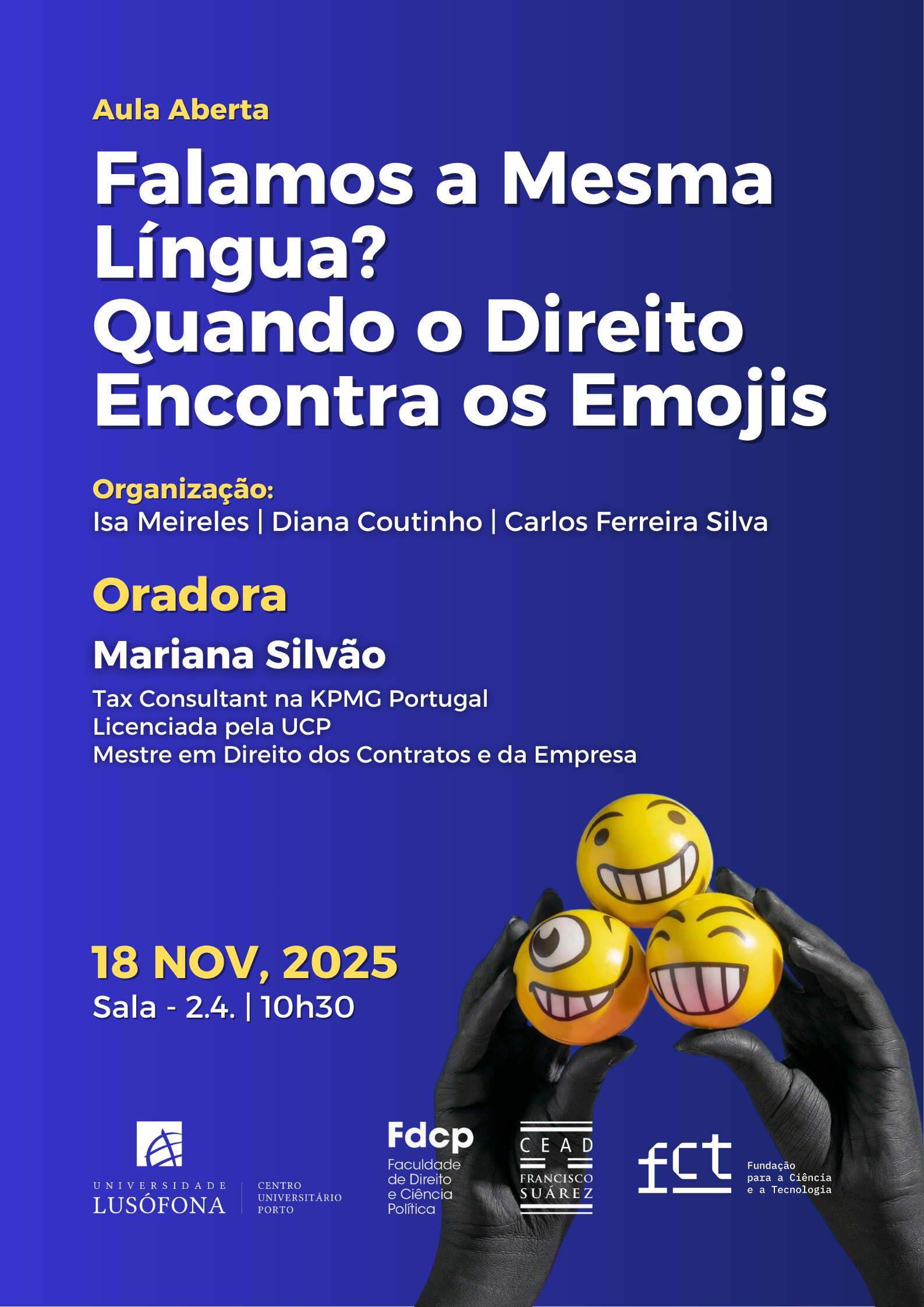 O CEAD Francisco Suárez convida toda a comunidade académica para a Aula Aberta “Falamos a Mesma Língua? Quando o Direito Encontra os Emojis”, que se realizará no dia 18 de novembro, às 10h30, na Sala -2.4.
