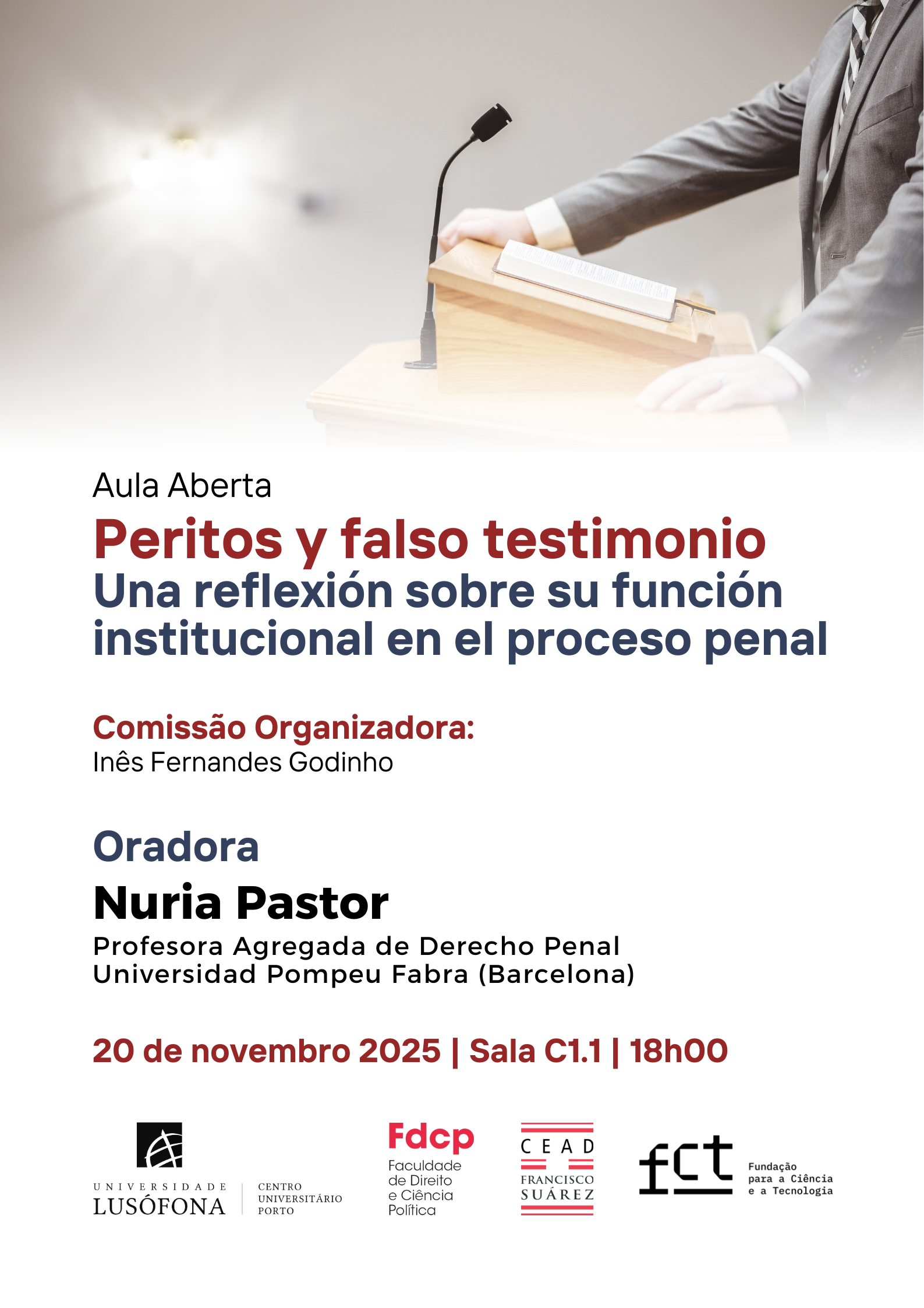 O CEAD convida toda a comunidade académica para a Aula Aberta intitulada “Peritos y falso testimonio. Una reflexión sobre su función institucional en el proceso penal”, que terá lugar no dia 20 de novembro de 2025, às 18h00, na Sala C1.1.