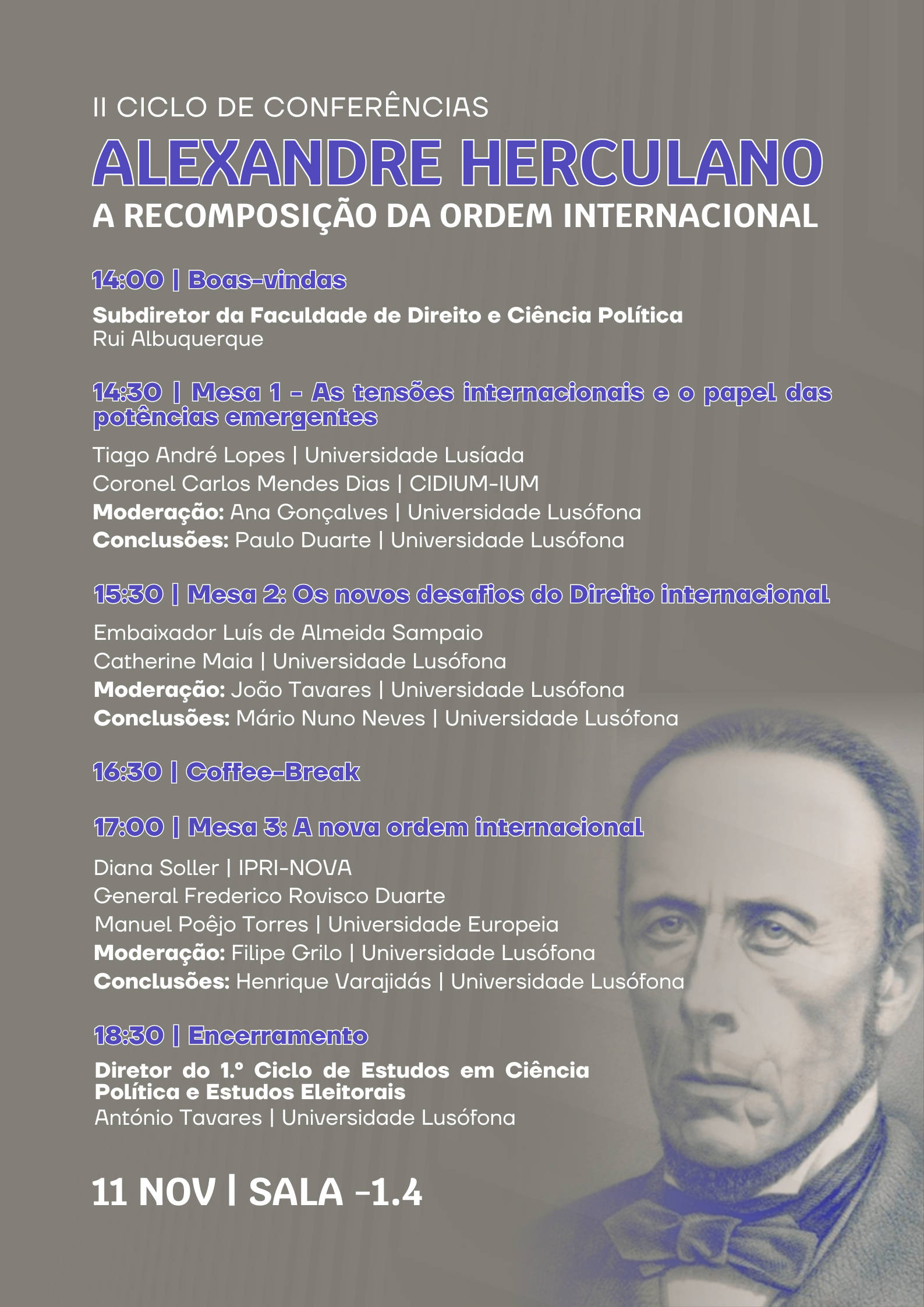 Divulgamos e convidamos toda a comunidade científica e académica a participar no II Ciclo de Conferências Alexandre Herculano, que se realizará no dia 11 de novembro de 2025, entre as 14h00m e as 19h00m, na Sala -1.4, no Polo 3.