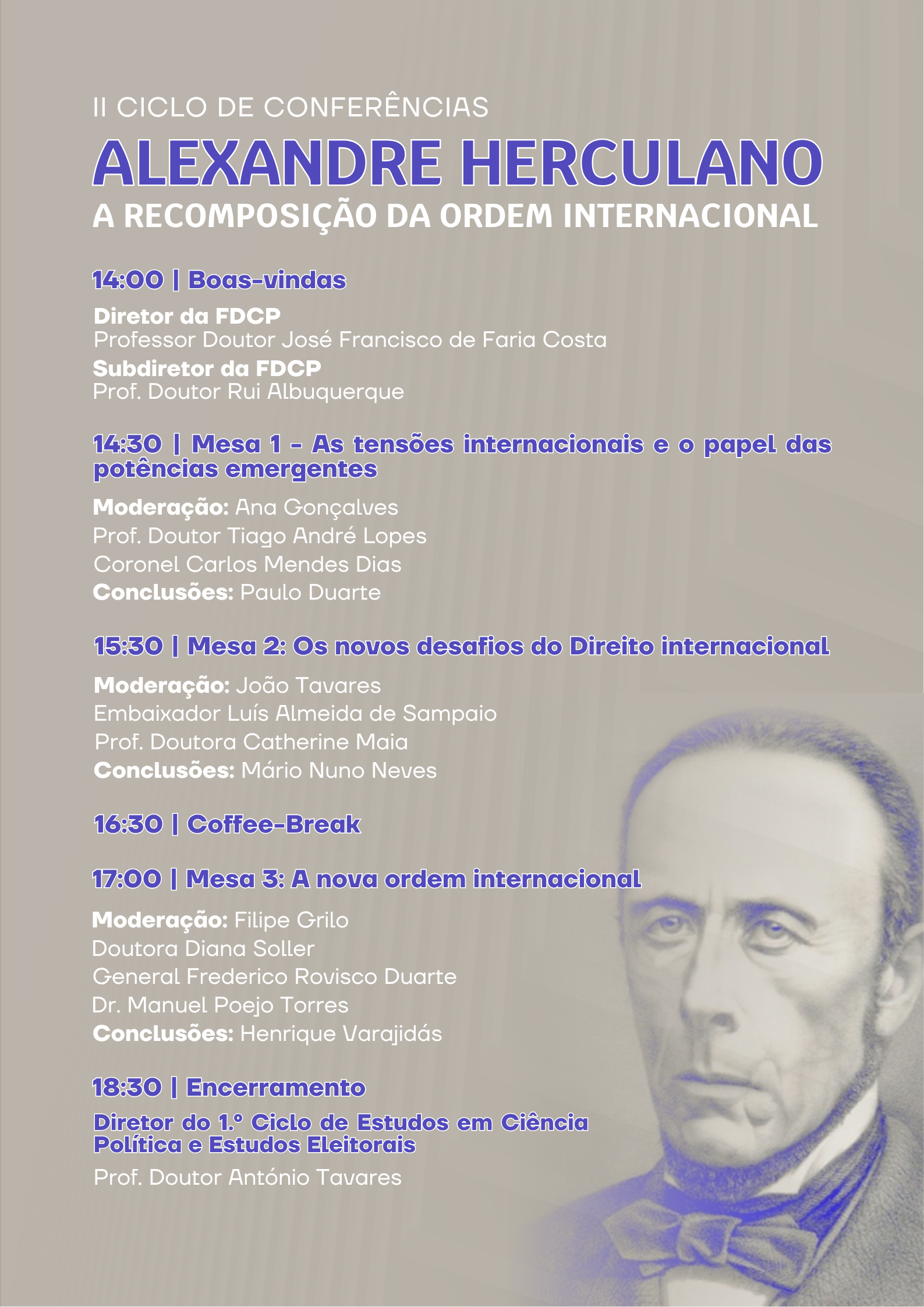 Divulgamos e convidamos toda a comunidade científica e académica a participar no II Ciclo de Conferências Alexandre Herculano, que se realizará no dia 11 de novembro de 2025, entre as 14h00m e as 19h00m, na Aula Magna (Ed. Novo). O programa do evento poderá ser consultado aqui.