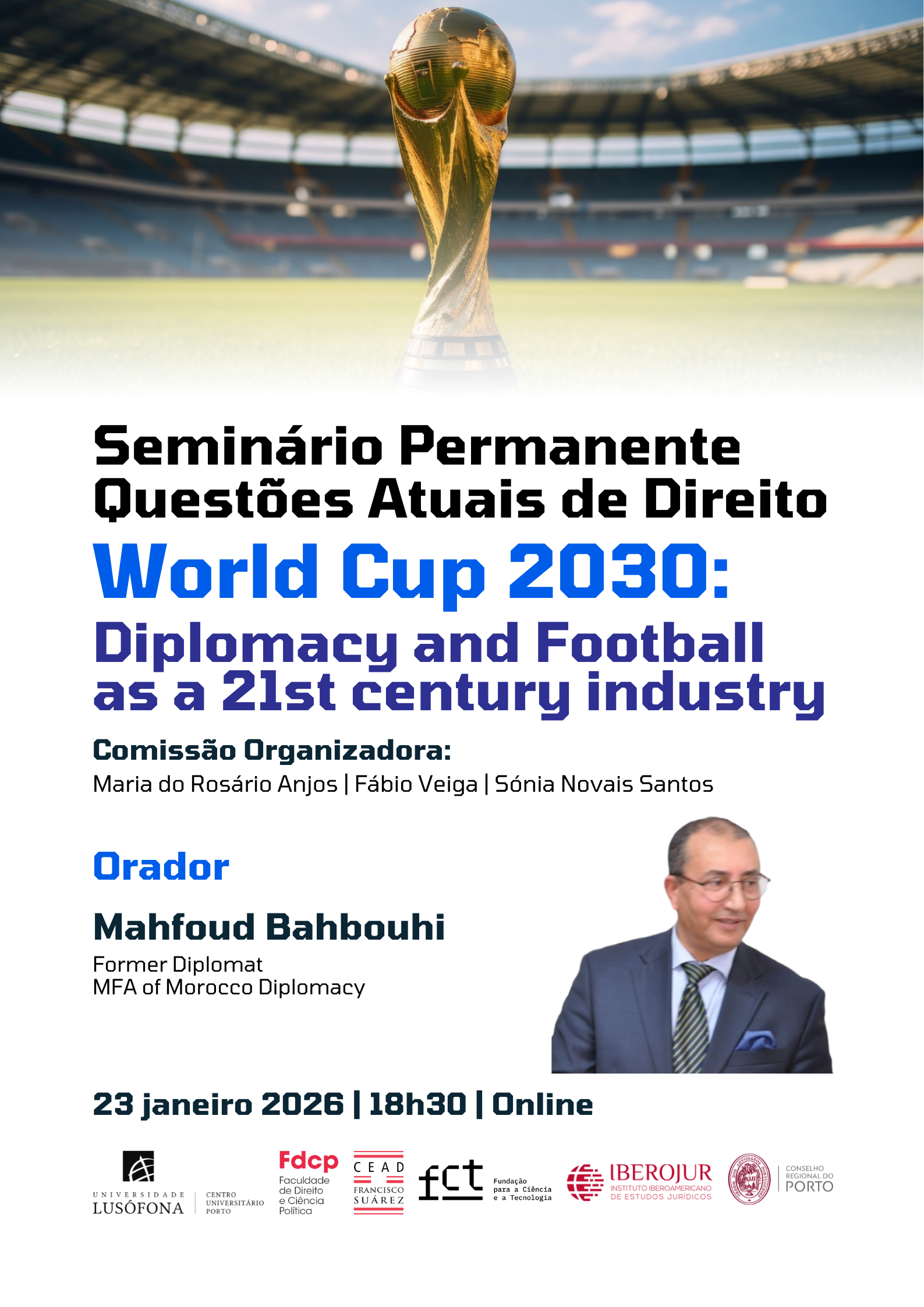 Neste sentido convidamos toda a comunidade académica e profissional a participar em mais uma sessão do Seminário Permanente “Questões Atuais de Direito”, dedicada ao tema "World Cup 2030: Diplomacy and Football as a 21st century industry"
