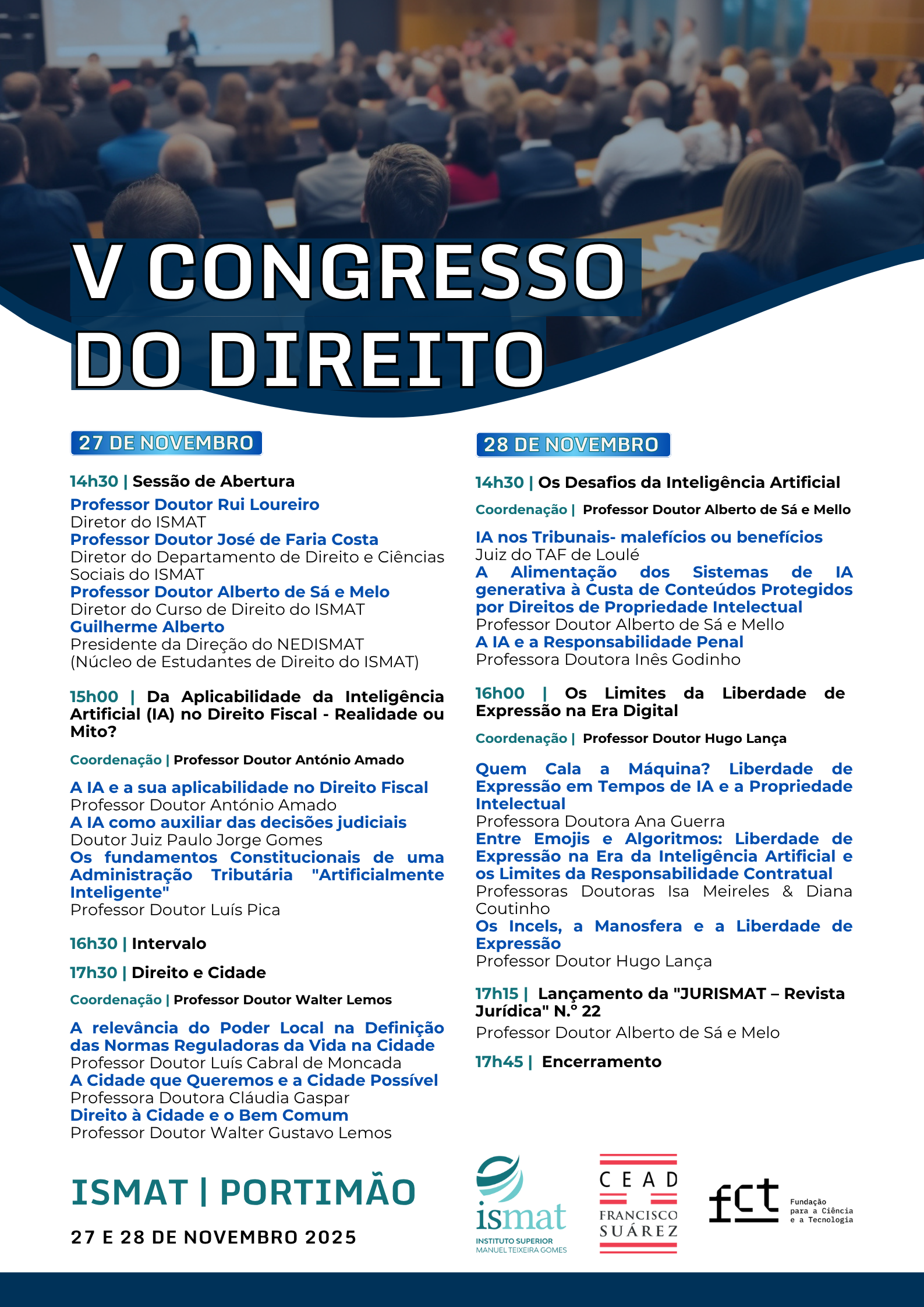 O CEAD Francisco Suárez tem o prazer de divulgar a realização do V Congresso do Direito – ISMAT, que decorrerá nos dias 27 e 28 de novembro de 2025, nas instalações do Instituto Superior Manuel Teixeira Gomes (ISMAT). O evento reúne especialistas, académicos, profissionais e estudantes para dois dias de reflexão e debate sobre os grandes desafios contemporâneos do Direito.