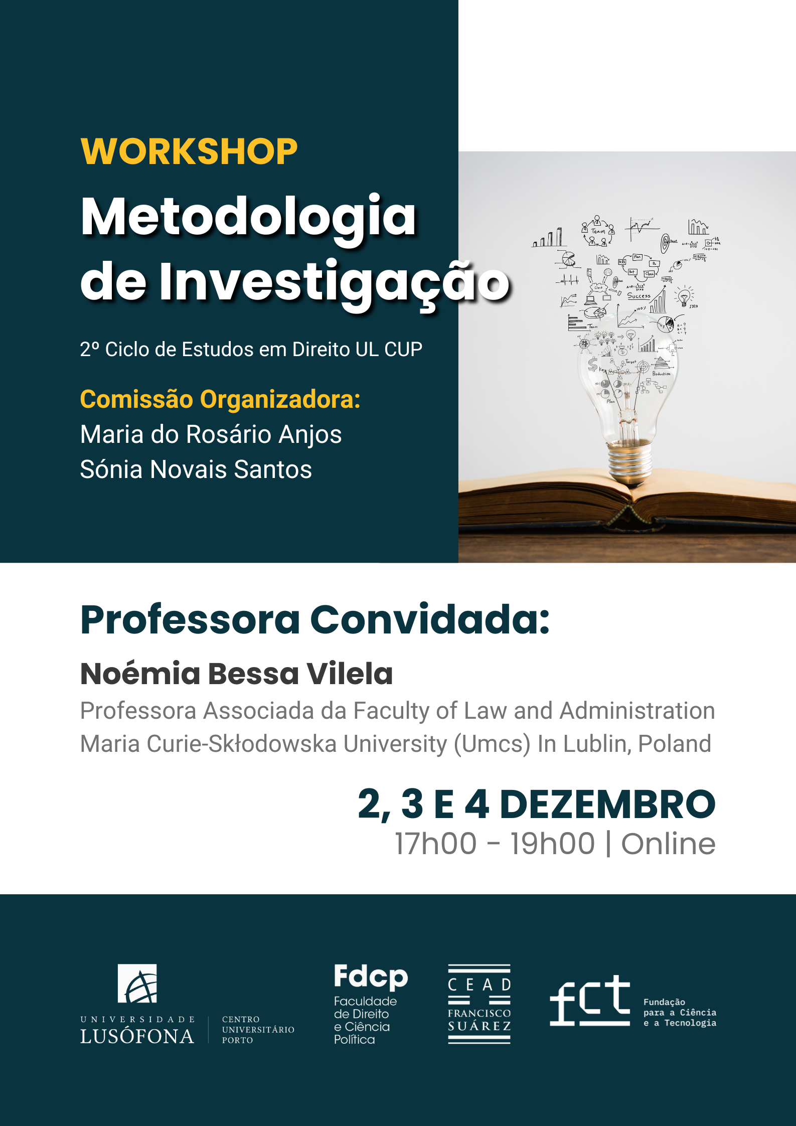 Contaremos com a presença especial da Professora Convidada Noémia Bessa Vilela, Professora Associada da Faculty of Law and Administration da Maria Curie-Skłodowska University (UMCS), em Lublin, Polónia, que partilhará a sua vasta experiência internacional em metodologias de investigação jurídica e científica.