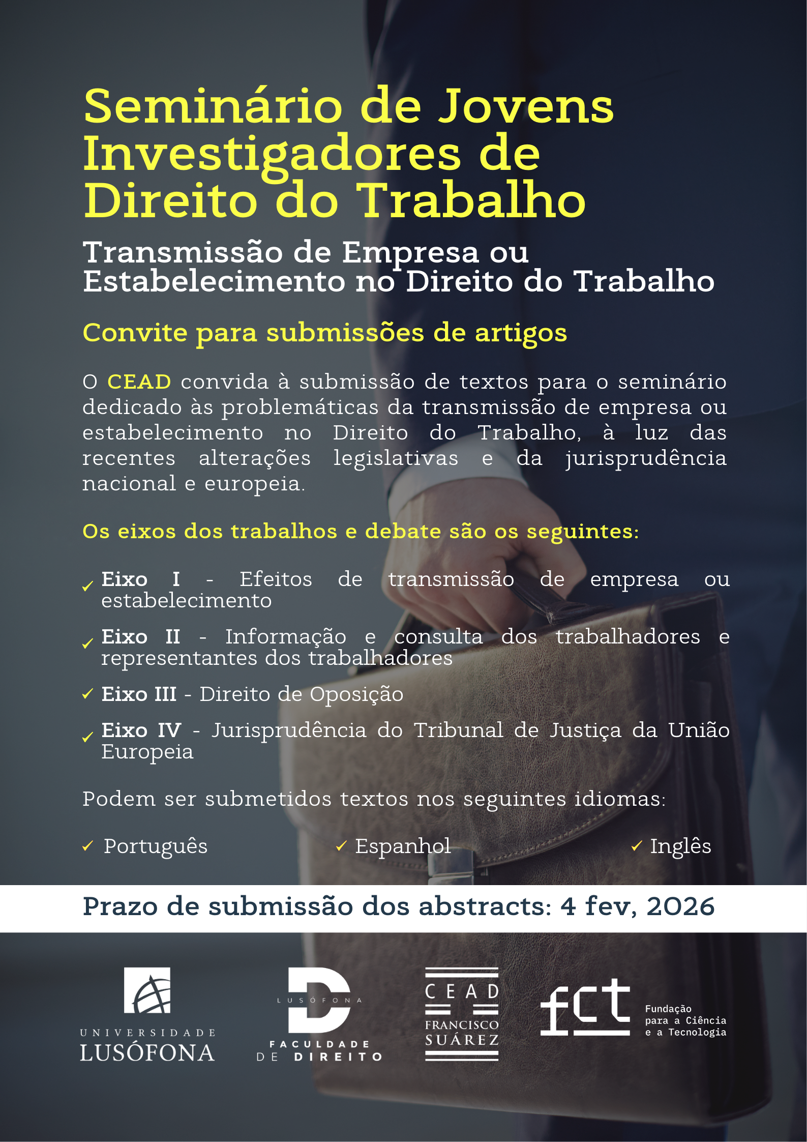 A propósito das problemáticas da transmissão de empresa ou estabelecimento no direito do Trabalho, tendo em consideração as alterações legislativas ao código do trabalho e a Jurisprudência nacional e do tribunal de justiça da união europeia, o CEAD organiza um Seminário tendo como principal objetivo dar à comunidade de investigadores juniores de Direito de trabalho, a oportunidade de partilhar, discutir e refletir sobre estudos, trabalhos ou Investigações científicas relacionadas com as problemáticas desse tema jurídico em debate.